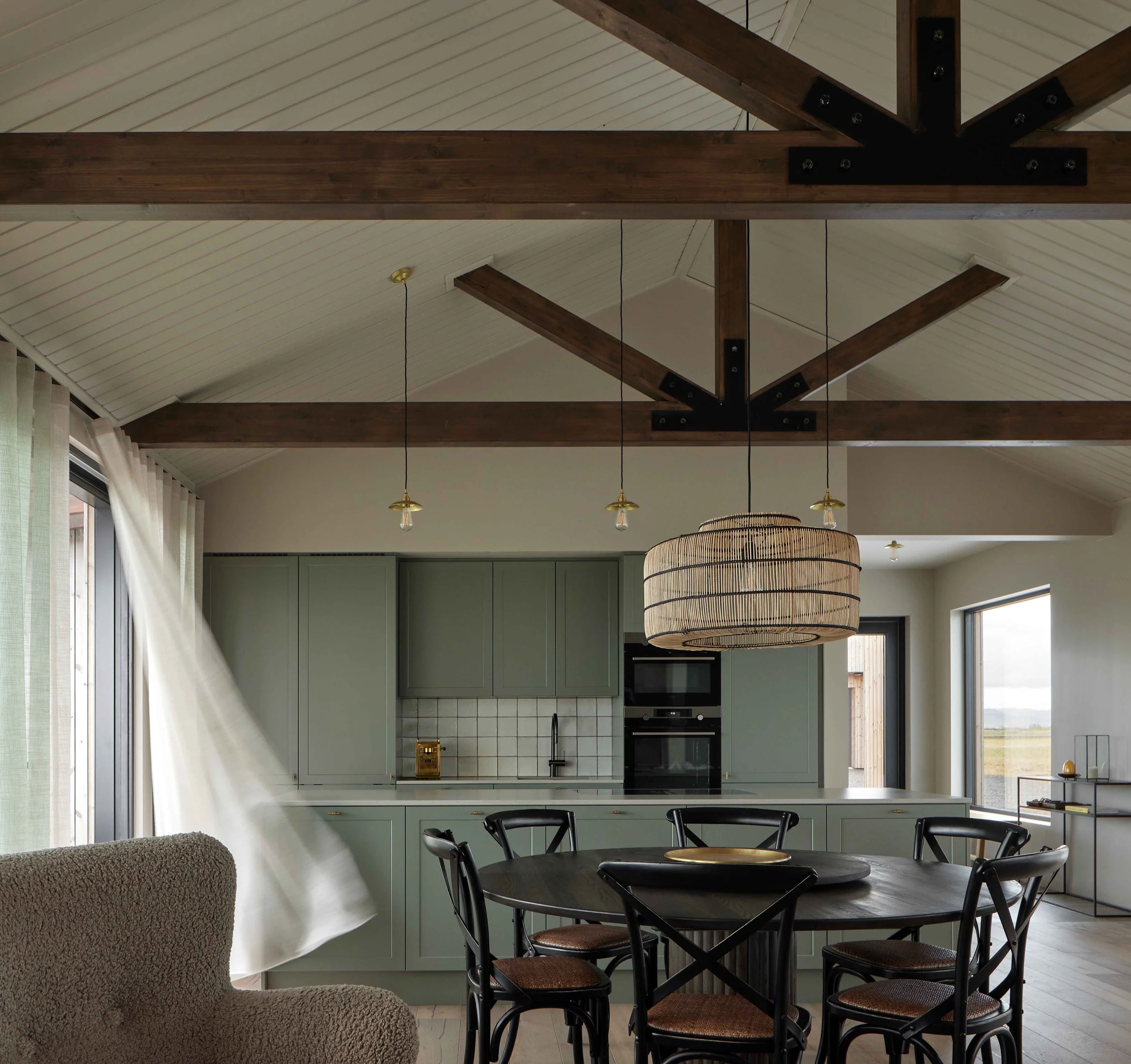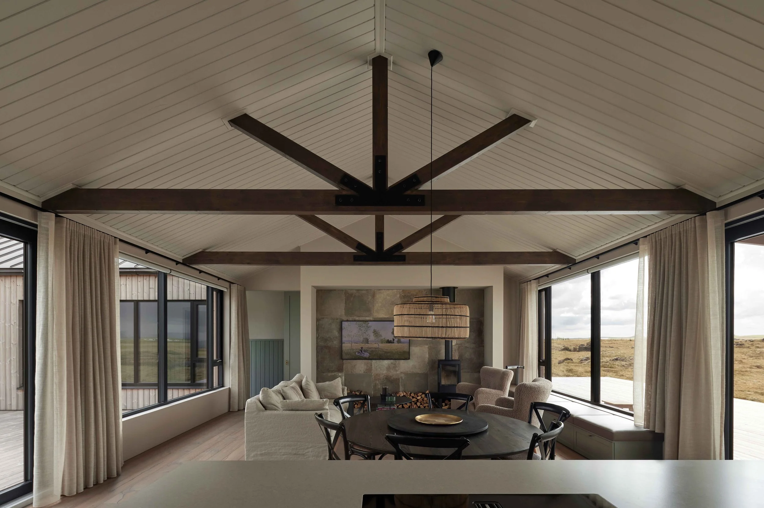 Í húsinu eru tvær svefnálmur og rúmgott sameiginlegt alrými í miðju, með beinu aðgengi út á verönd í tvær áttir. Í ysta hluta hússins er heimaskrifstofa og bókasafn, þar sem hægt er að draga sig í hlé frá alrýminu. Innanhússhönnunin er mótuð með náttúrulegum efnum og hlýjum litatónum sem endurspegla umhverfið og skapa heildræna upplifun.